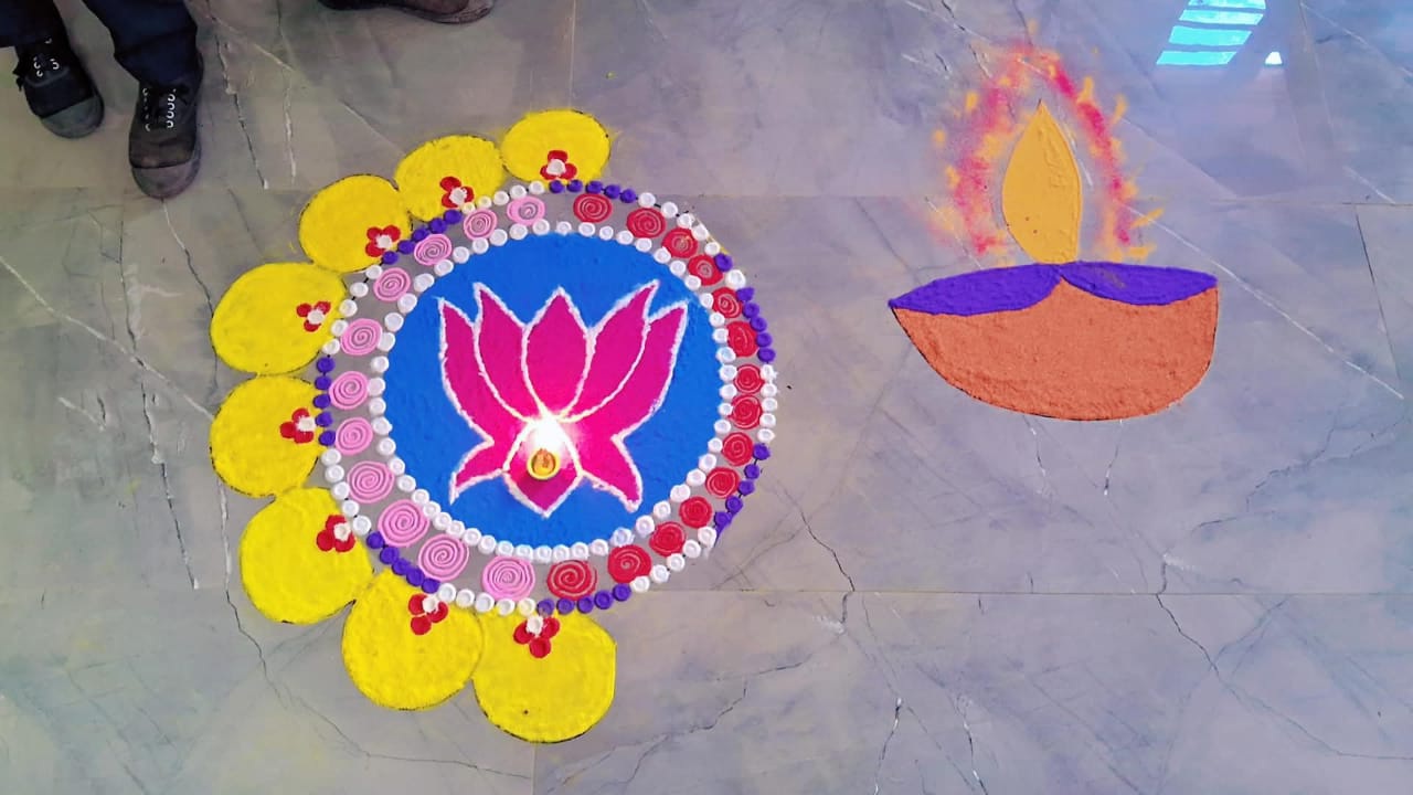The highlight of the day was the energetic Rangoli Making Competition, where our talented students transformed the school floor into stunning canvases of color. From intricate traditional motifs like the lotus and peacock to a beautiful depiction of Lord Rama’s return, each design was a testament to their artistic flair and dedication. The beautiful patterns, vibrant hues, and illuminated diyas truly captured the essence of Diwali—the triumph of light over darkness and good over evil.